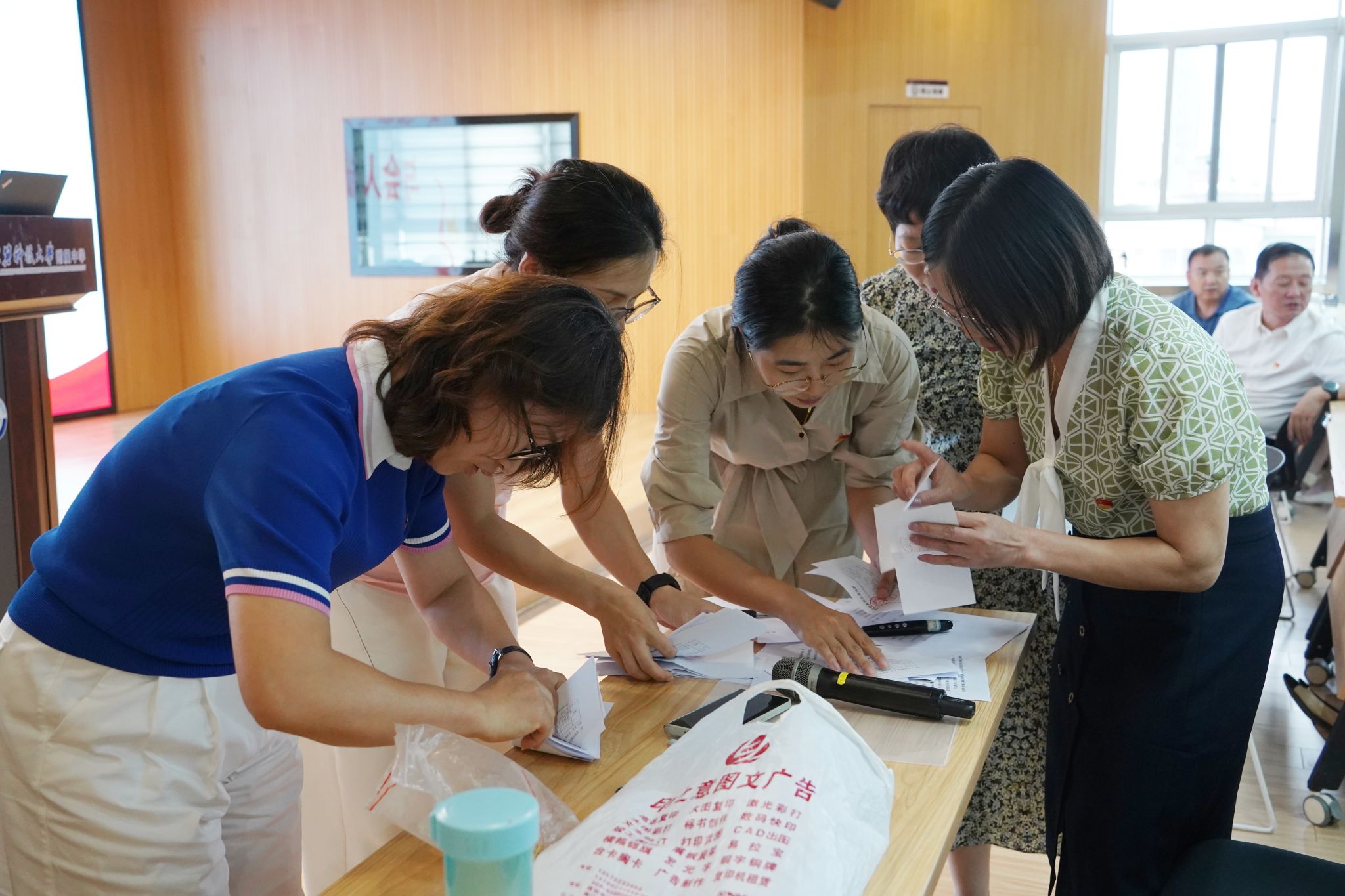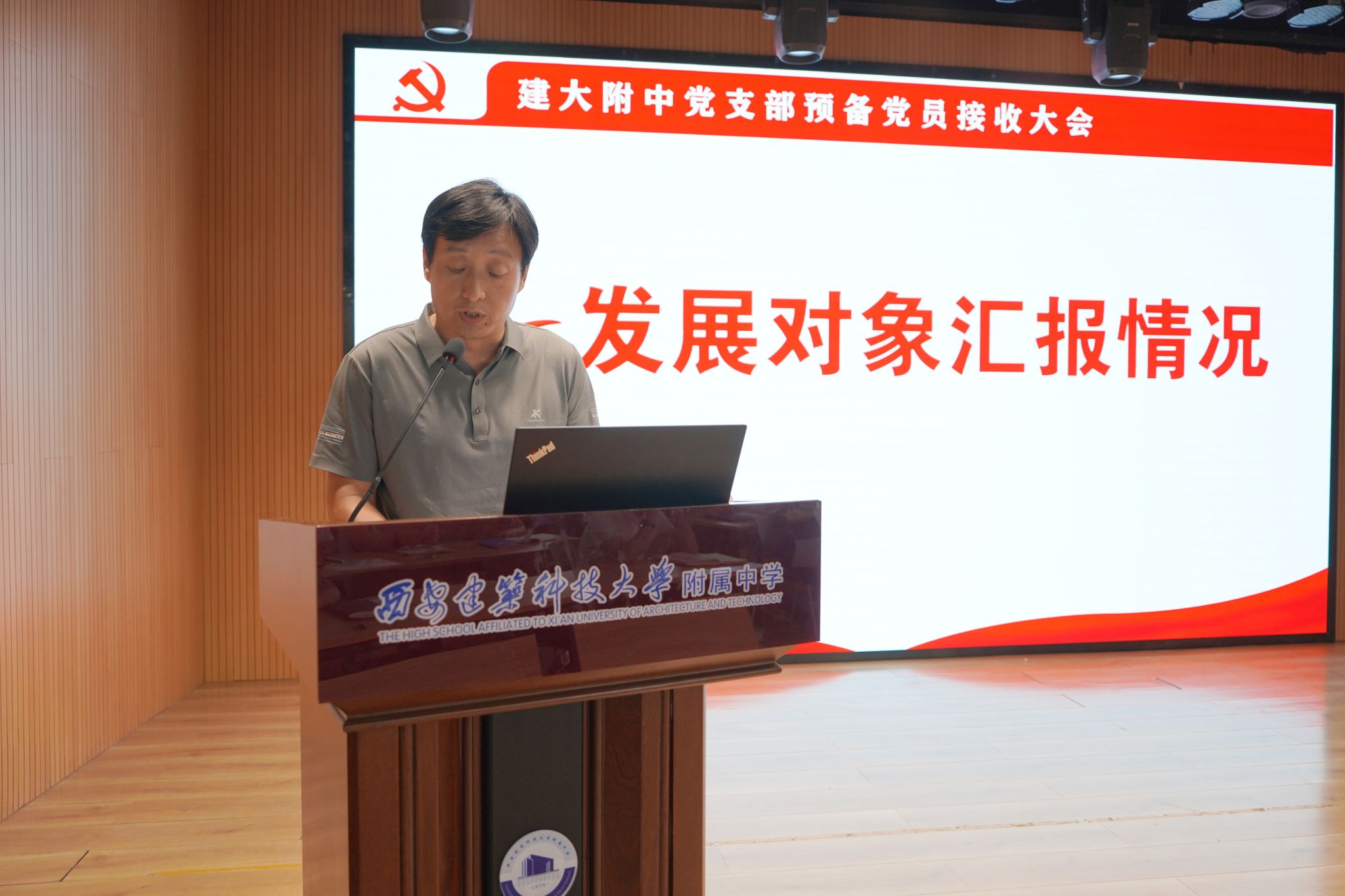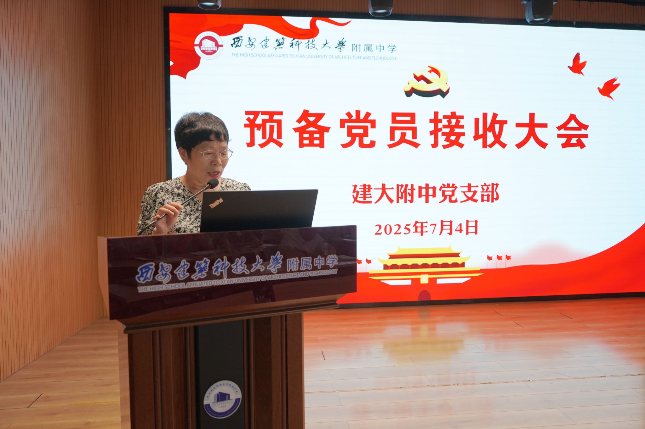 2025年7月4日,建大附中党支部于六楼活动中心召开预备党员接收大会,党支部副书记、副校长姚书雅主持,全体党员参会,审议接收王战锋、安永勇同志为中共预备党员事宜。
