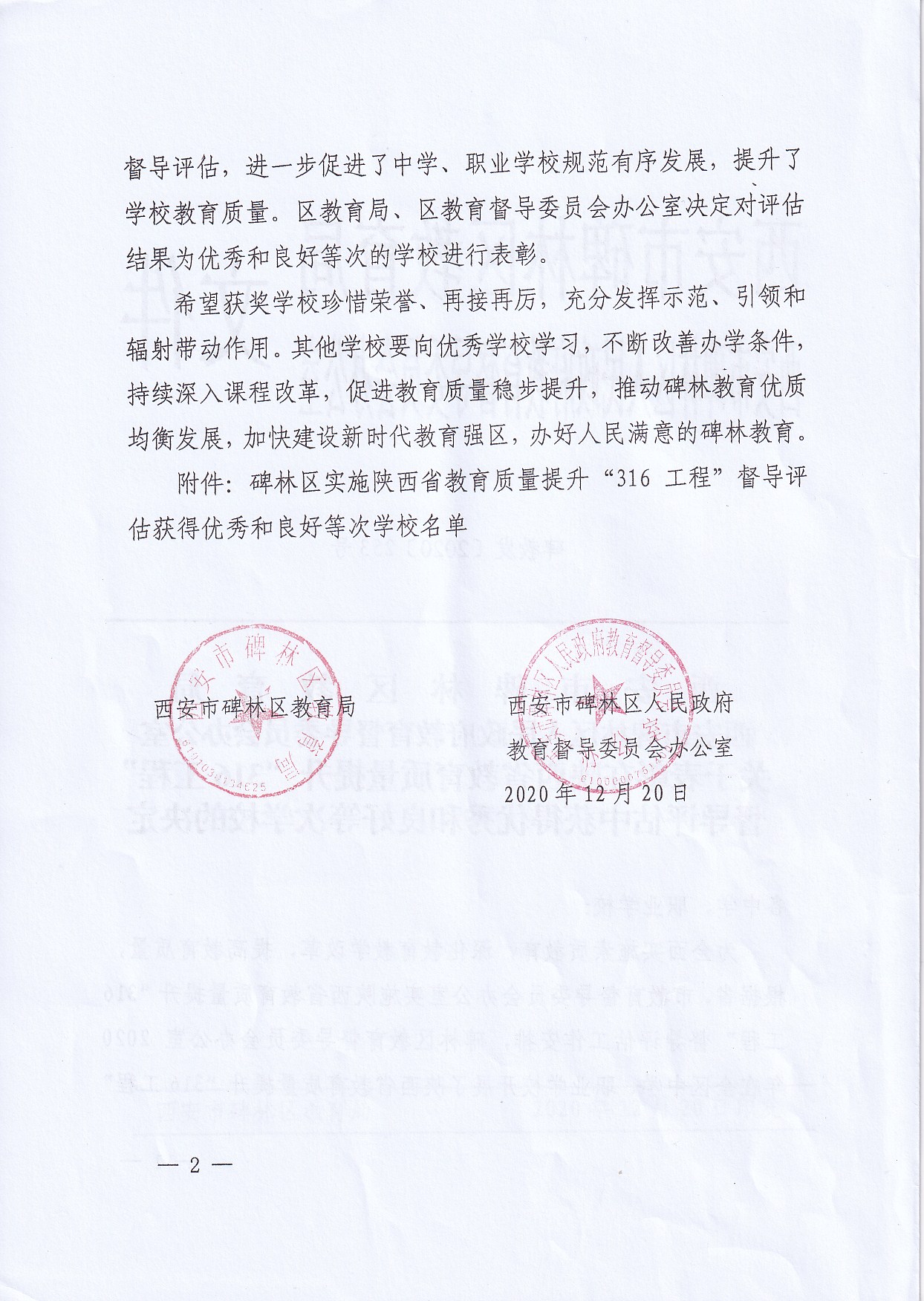 热烈祝贺建大附中荣获碑林区实施陕西省第三轮“316工程”督导评估“优秀学校”称号