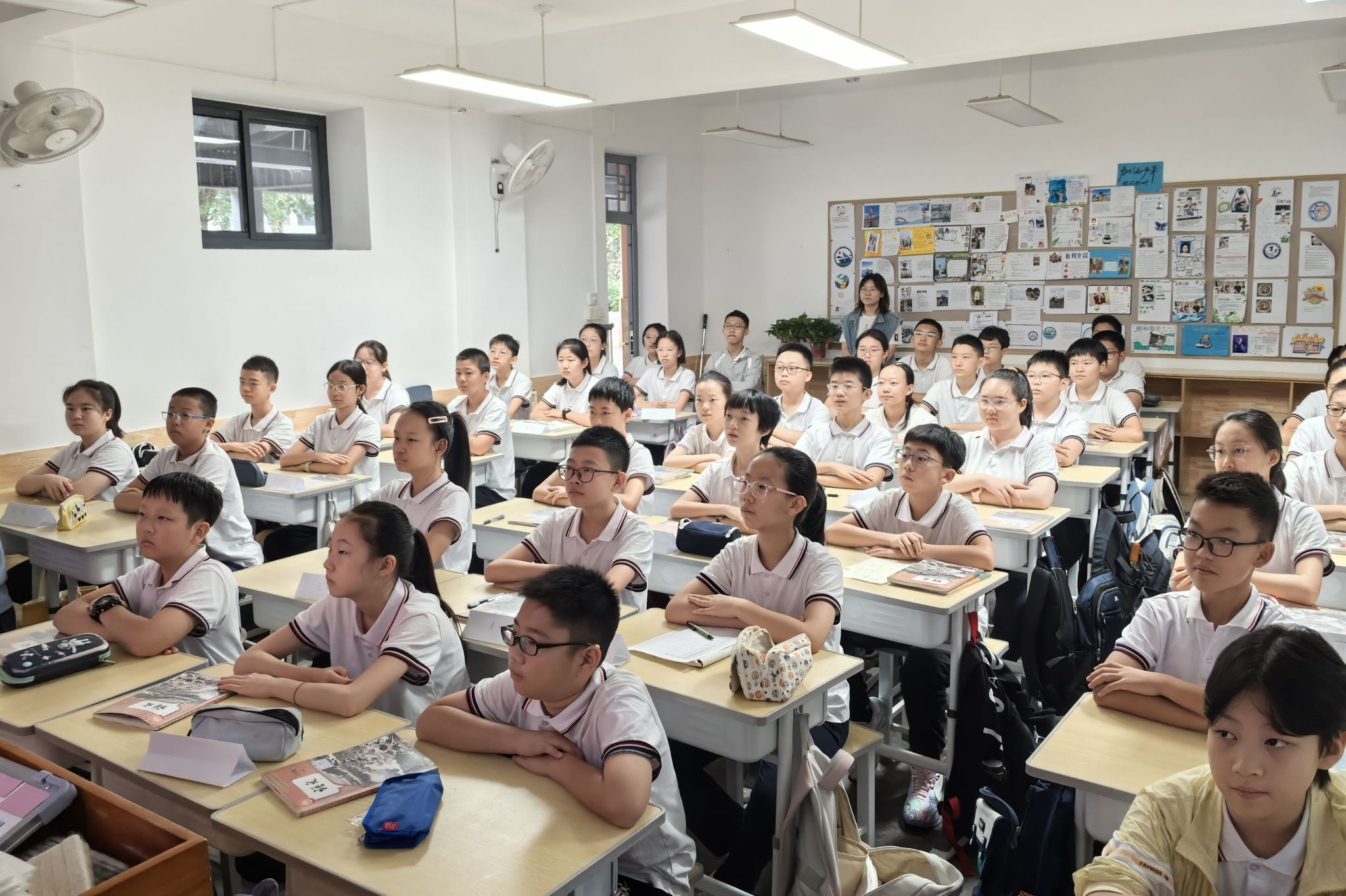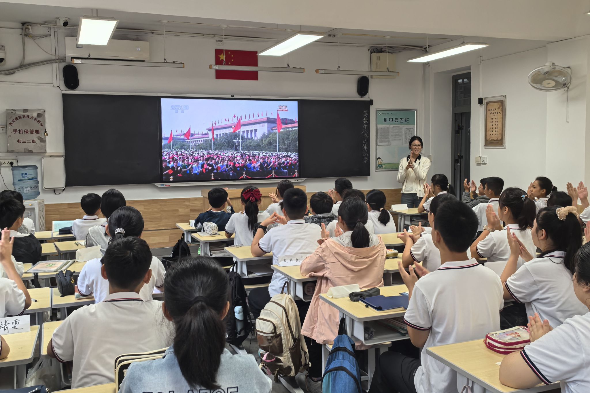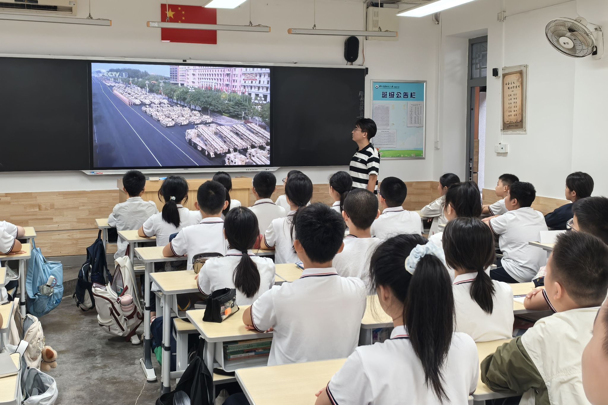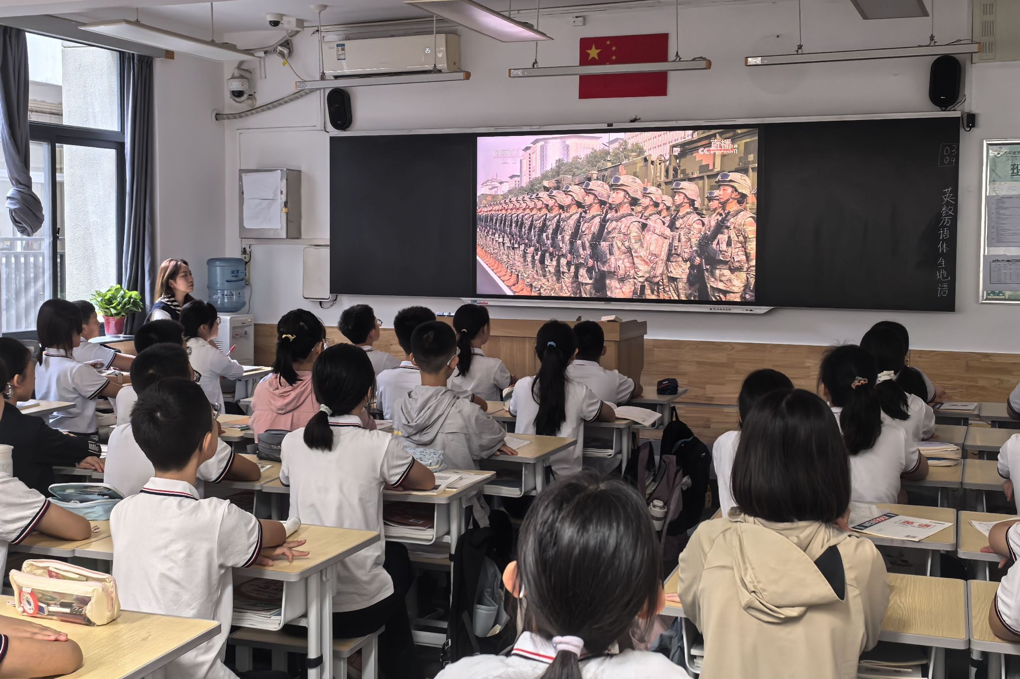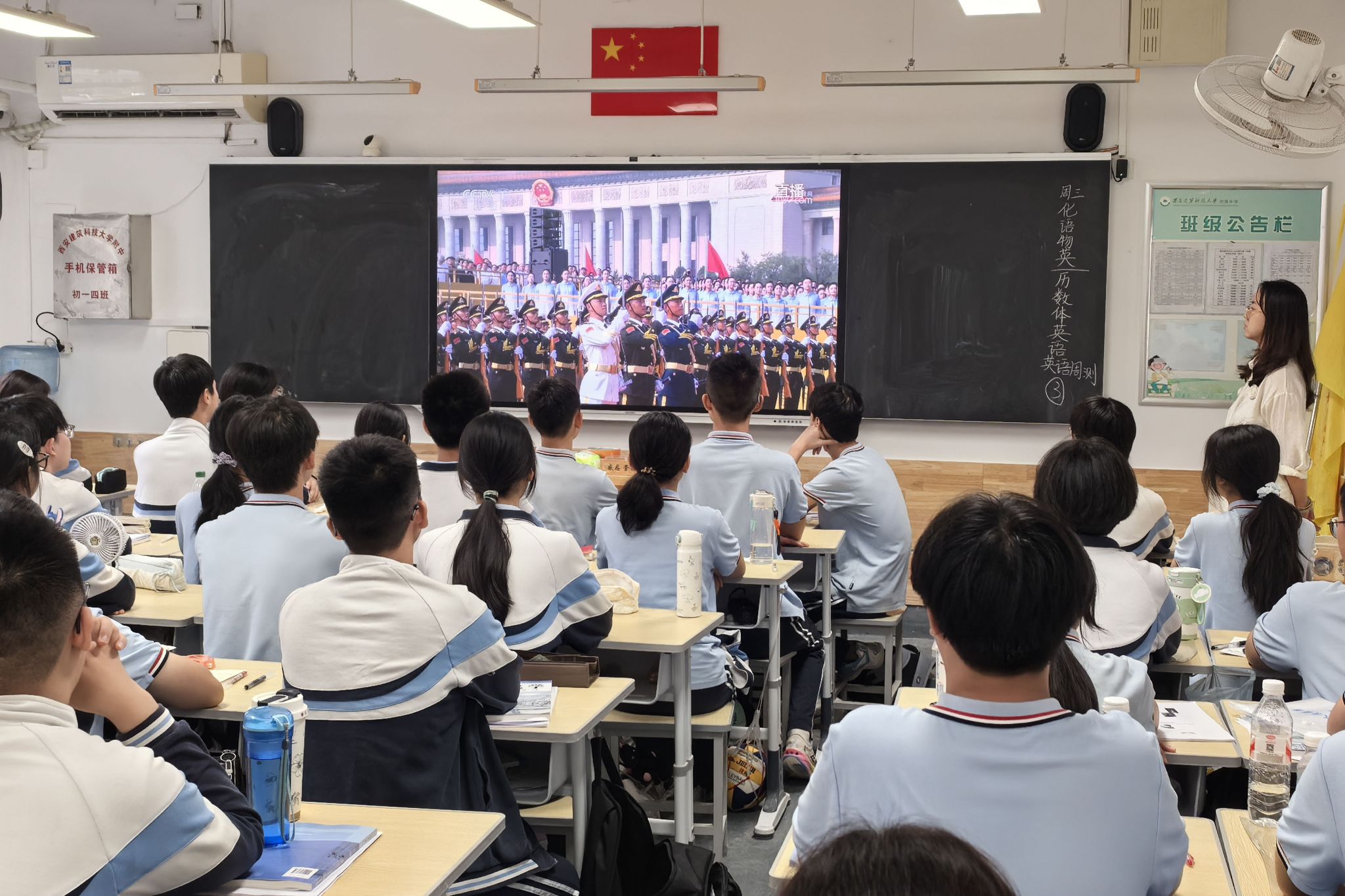 与此同时,教室里,同学们端正地坐在课桌前,目不转睛地盯着大屏幕。庄严的仪式在稚嫩的心田播下火种。它让同学们如此真切地感到“祖国”二字的分量:强大的国防、自信的步伐、从容的目光,都在无声地诉说——和平来之不易,富强必须接续。孩子们的眼里闪着光,那是对英雄的敬仰,更是对明天的承诺。