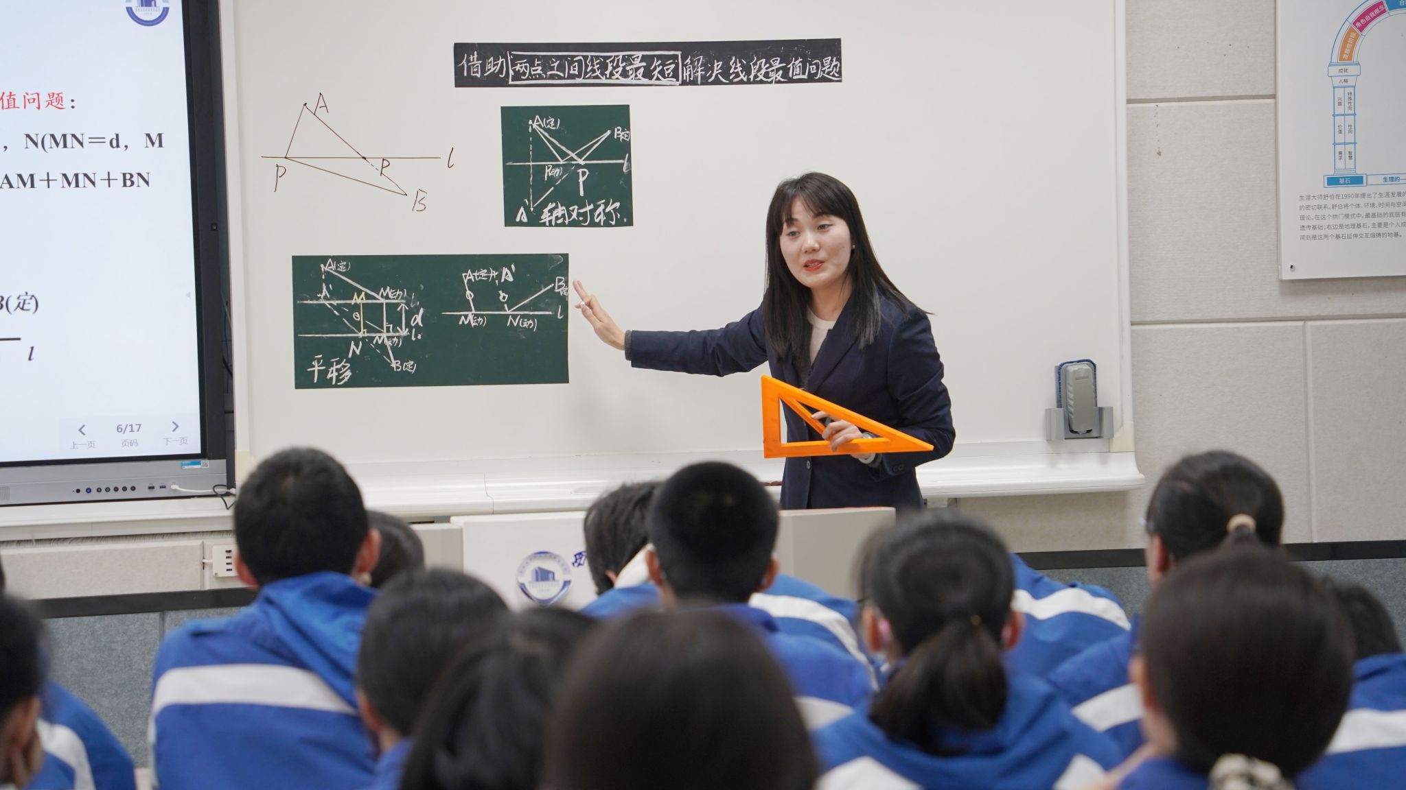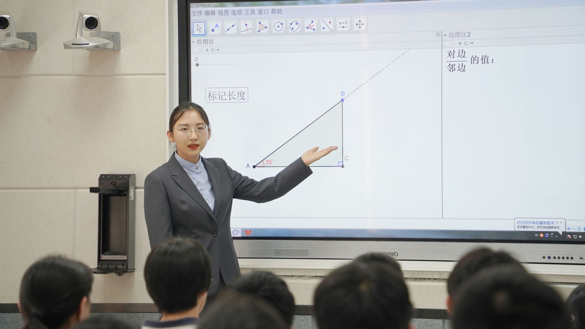 本次活动以“数智启思,匠心塑师”为核心主题,聚焦课堂教学实效,呈现两节示范课。首节由建大附中席镭航执教《锐角三角函数——正切》,她以坡度测量、梯子倾斜度等现实场景为切入点,引导学生从直观观察到抽象建模,逐步推导正切概念,课堂逻辑清晰、互动充分,生动诠释“数智启思”理念;第二节是张静的《借助“两点之间线段最短”解决线段最值问题》,她以典型几何模型为线索,设计“基础探究—进阶应用—拓展延伸”三层任务,层层递进培养学生逻辑思维与解题能力,展现扎实的教学功底与创新的设计思路。